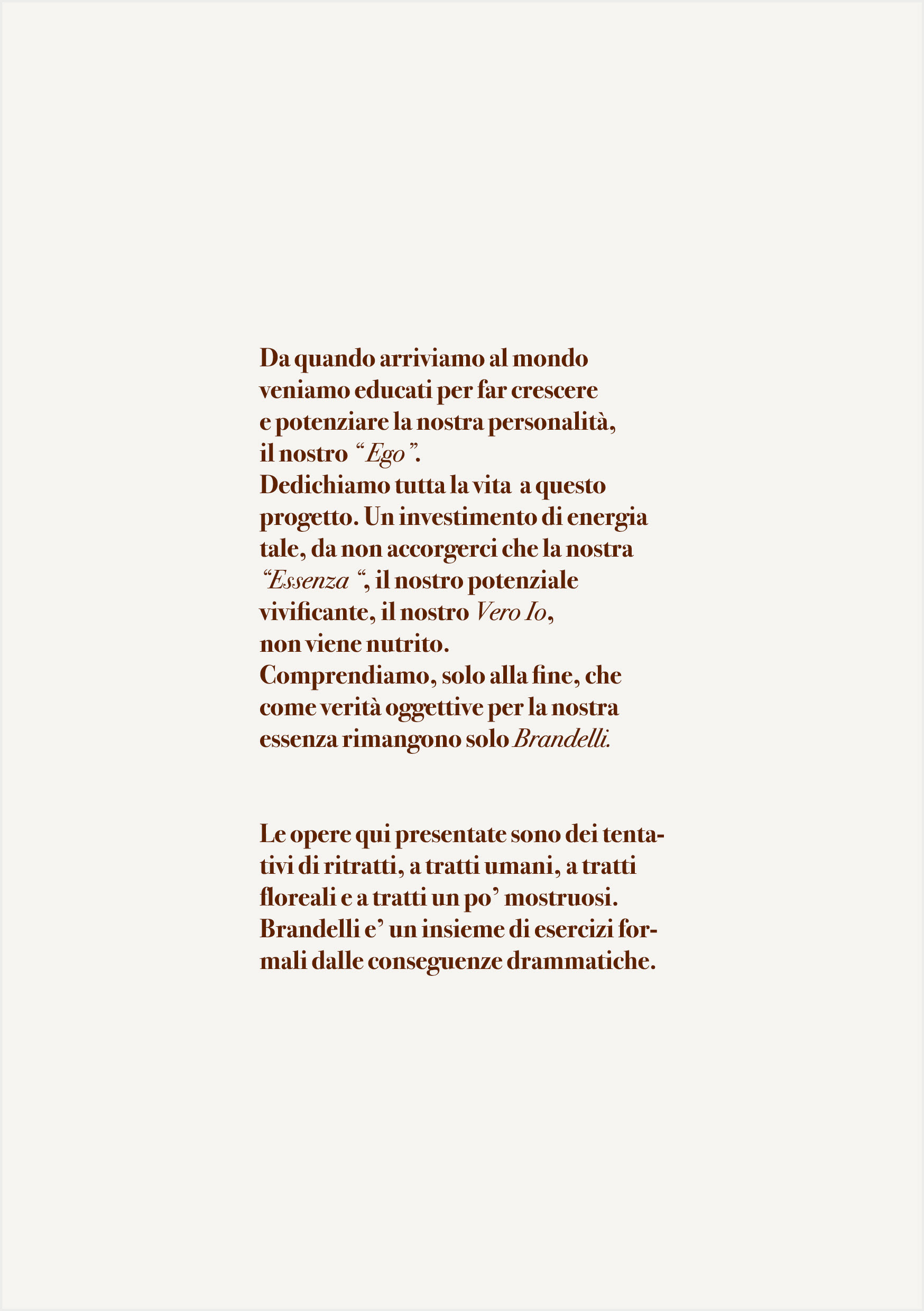 Creare un catalogo destinato a galleristi e curatori che restituisse il senso di questo lavoro: non un semplice portfolio, ma uno strumento narrativo capace di accompagnare il lettore dentro l’universo dell’artista e del progetto “Brandelli”. Il catalogo doveva far emergere la forza concettuale delle opere e al tempo stesso renderle leggibili, collezionabili e presentabili nel contesto del mercato dell’arte contemporanea.